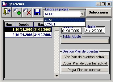 • Empresa propia: Me permite seleccionar la empresas propia sobre la cual quiero ver los ejercicios existentes. Una vez que la seleccione, podré ver el listado de los distintos ejercicios de dicha empresa (fechas desde / hasta).